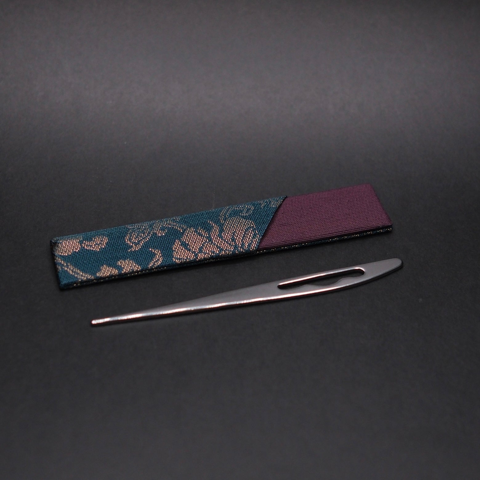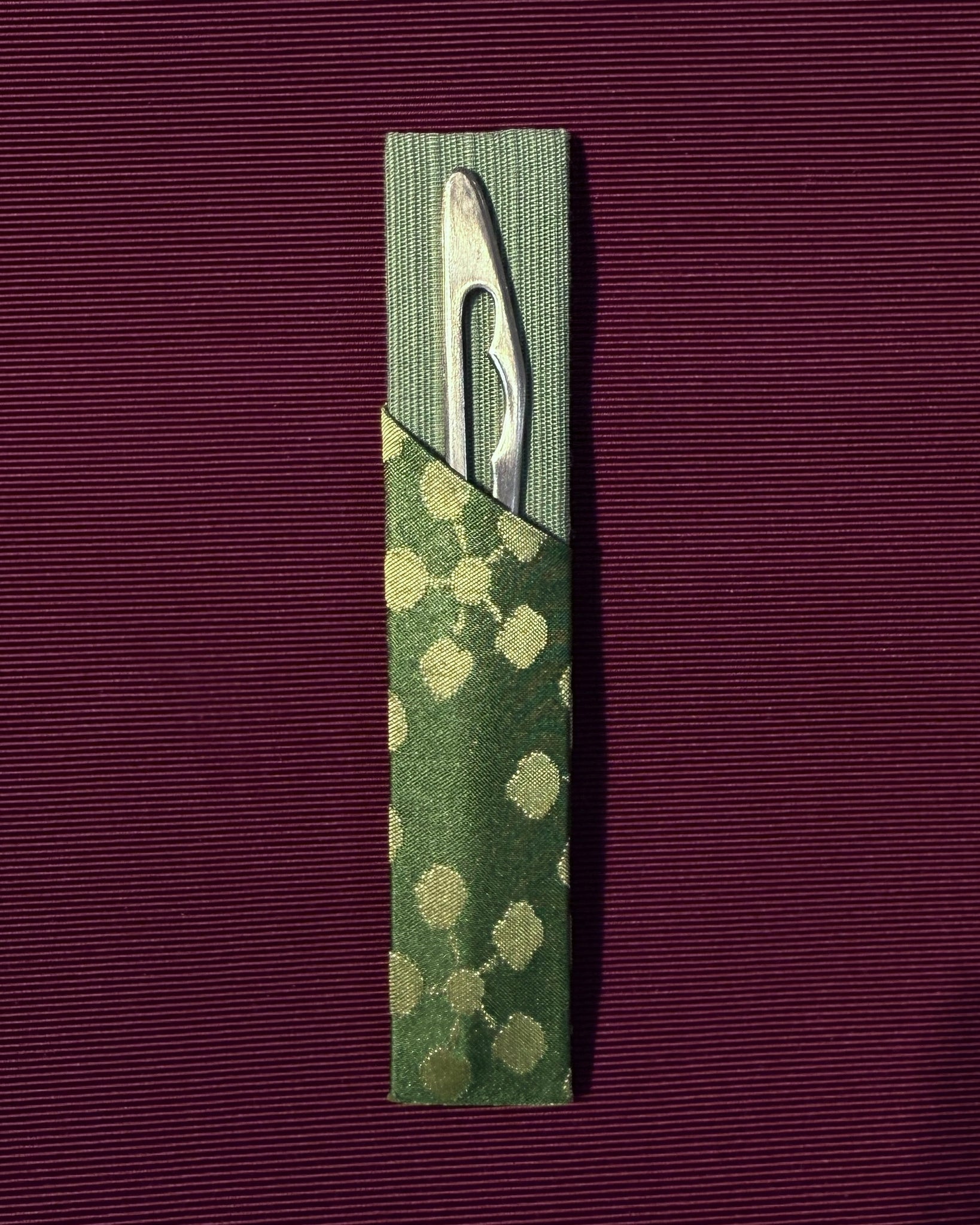 A stainless steel pick and silk case used to eat small traditional Japanese sweets called wagashi.