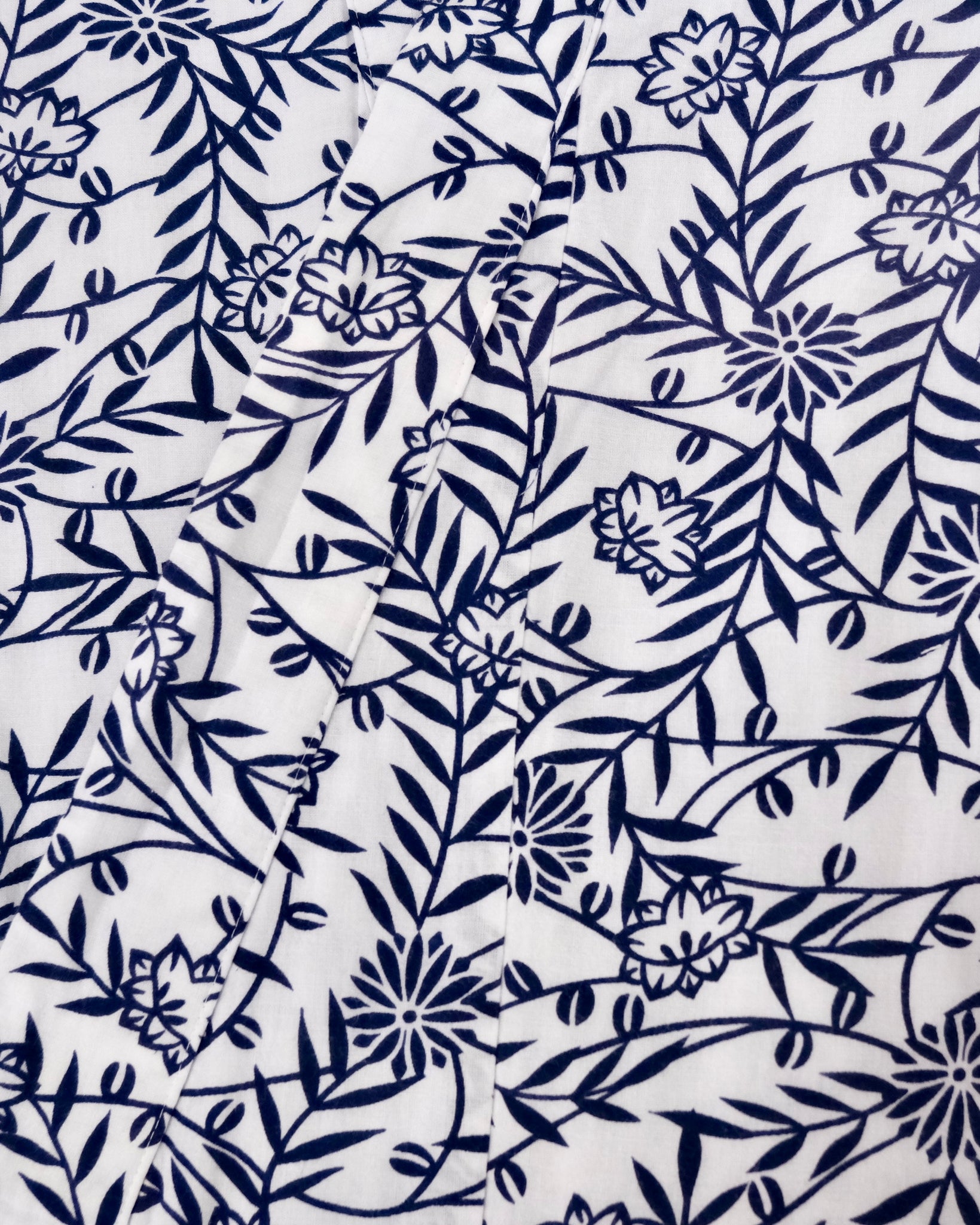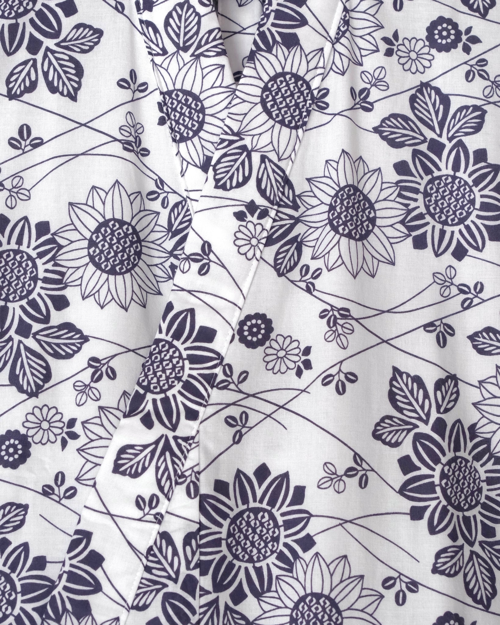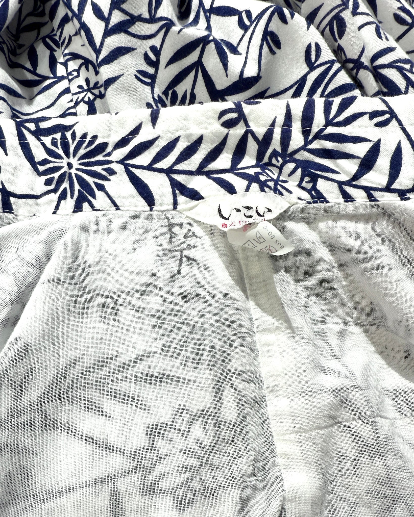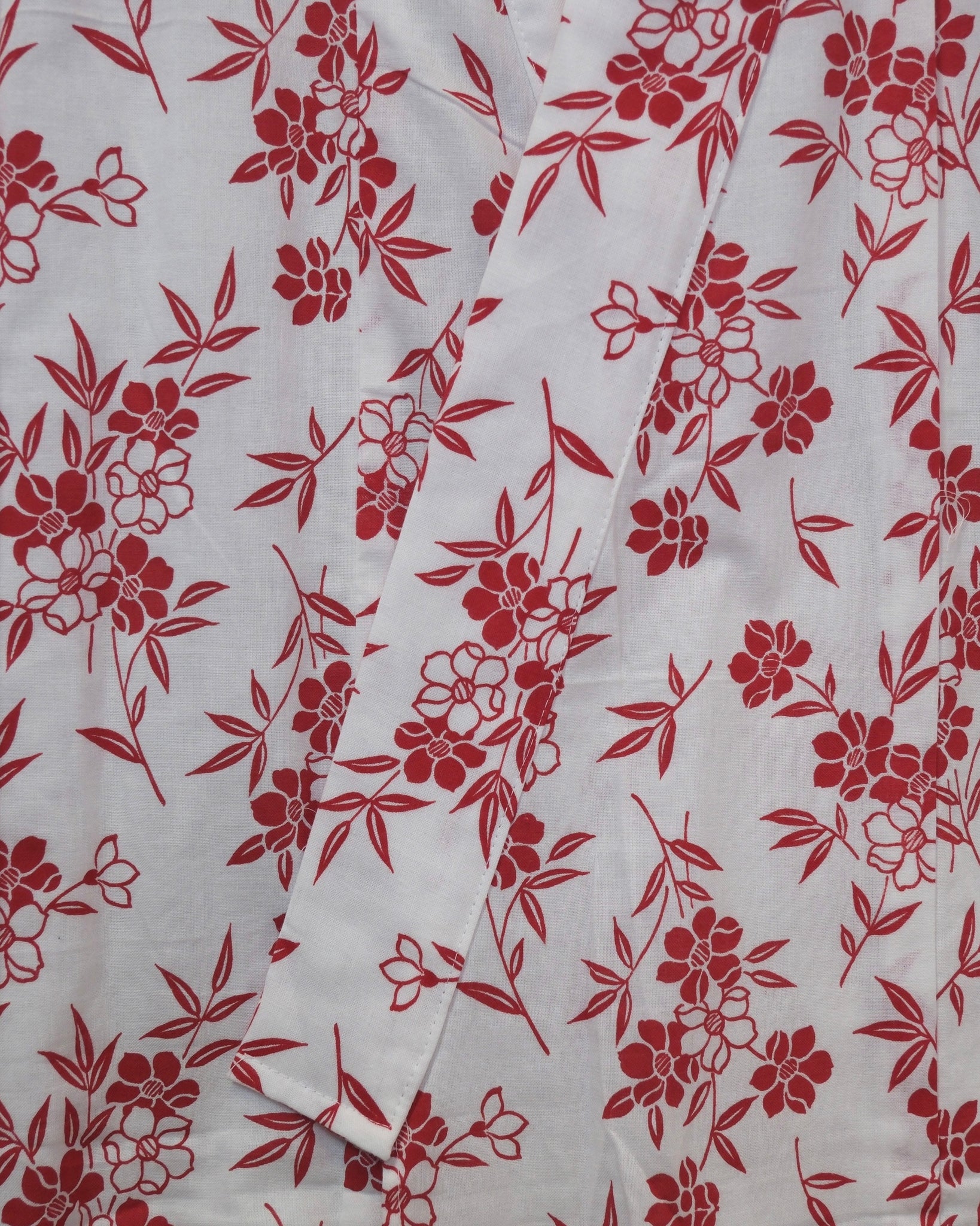 A comfortable white robe lined in soft cotton gauze with different floral patterns and leaves to make a flowery print to wear after a bath. Comes with matching belt. Nemaki