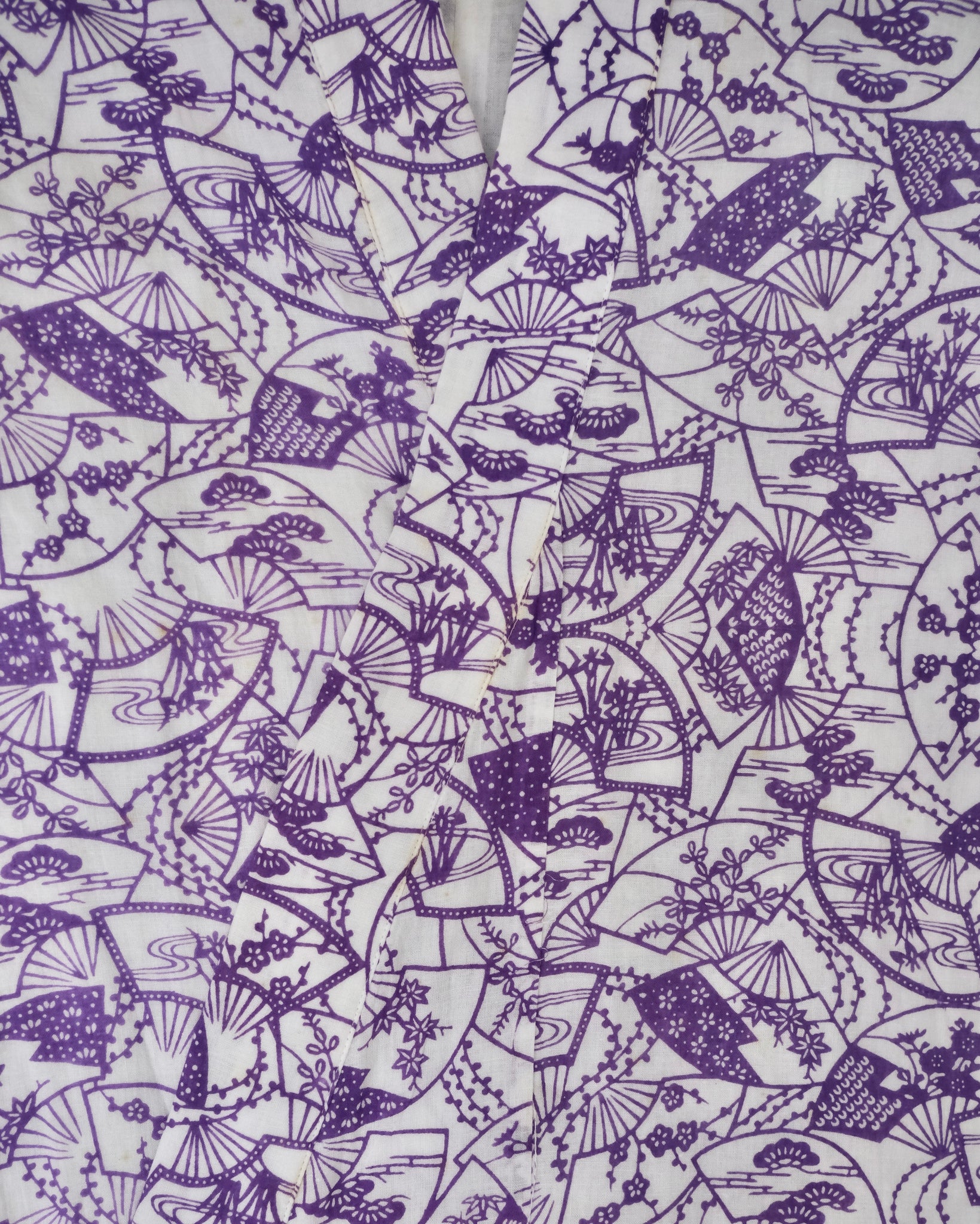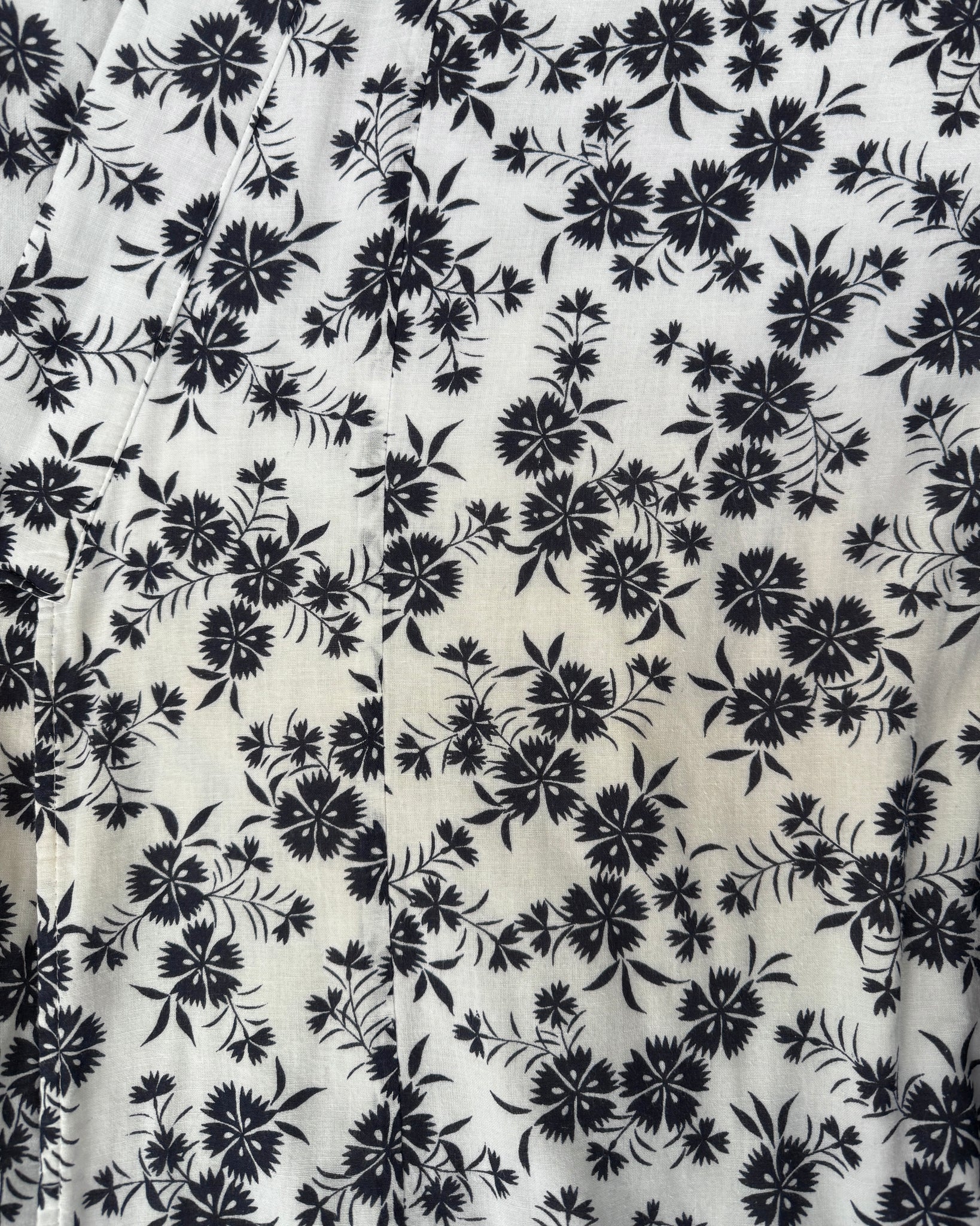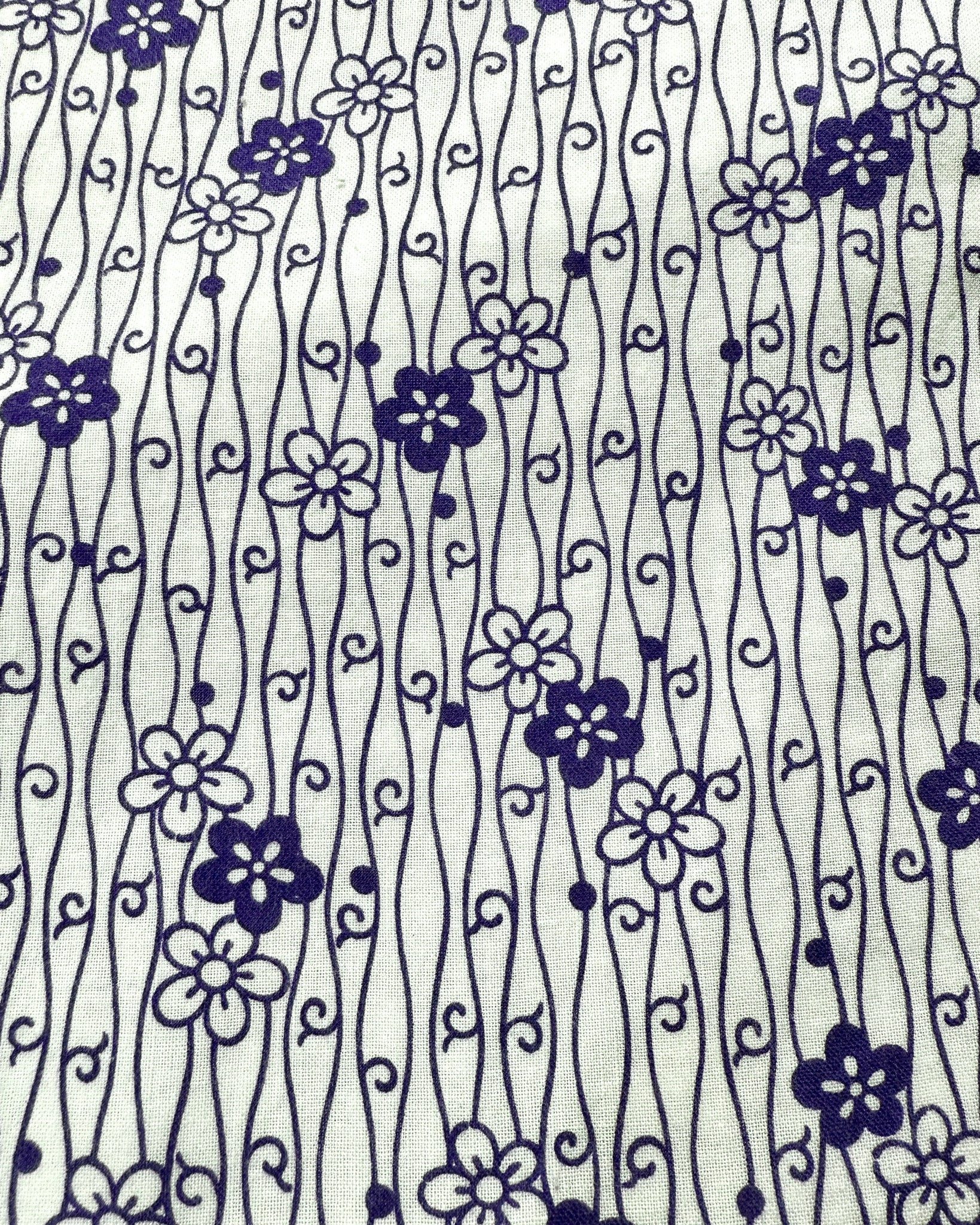 A comfortable white robe lined in soft cotton gauze with different floral patterns and leaves to make a flowery print to wear after a bath. Comes with matching belt. Nemaki